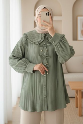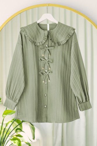 Önü Kurdele Detaylı Düğmeli Önlük Yaka Gömlek -Çağla Y