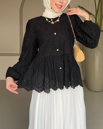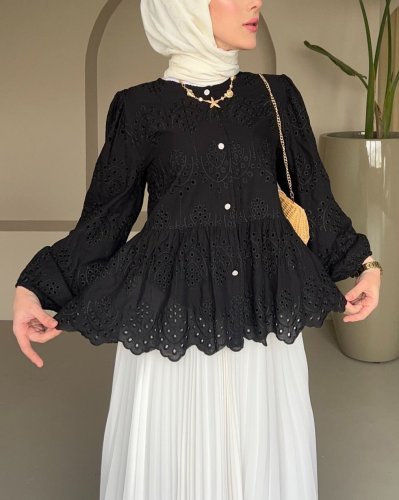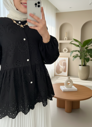 Kolu Lastikli Ajurlu Düğmeli Astarlı Gömlek -Siyah