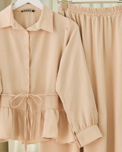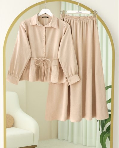Parçalı Büzgülü Bluz Etekli Takım -Bej