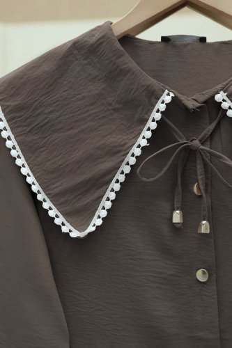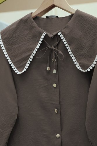 Bebe Yaka Dantelli Kolu Lastikli Gömlek -Kahve