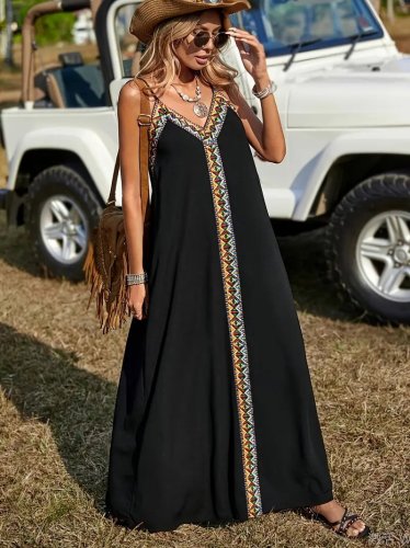 Kadın askılı v yakalı etnik şerit detaylı uzun viskon elbise