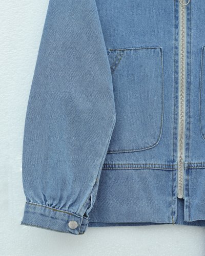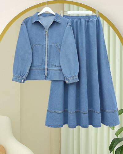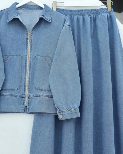 Önü Fermuarlı Çift Cepli Etekli Kot Takım -Buz Mavi
