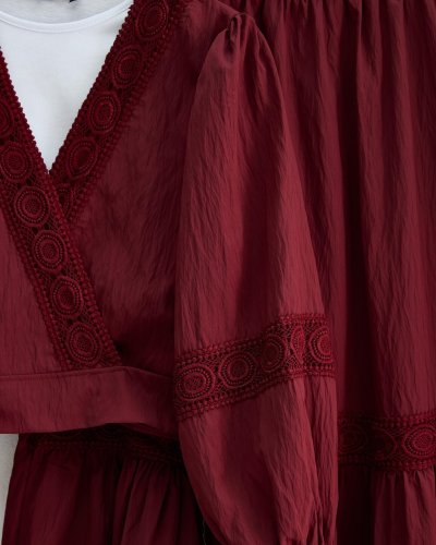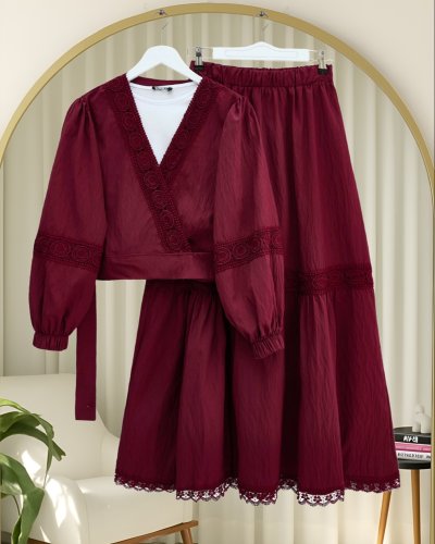 Dantel Detaylı Bağlamalı Kolu Lastikli Kraş Etekli Takım -Bordo