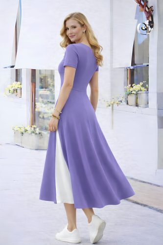 Kadın kısa kollu asimetrik yakalı düğme detaylı midi viskon elbise
