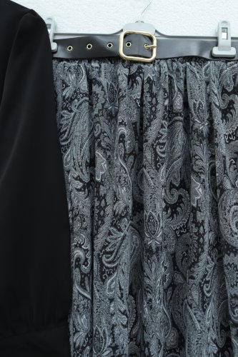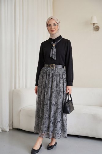 Beli Kemerli Fularlı Astarlı Etekli Şifon Takım -Siyah
