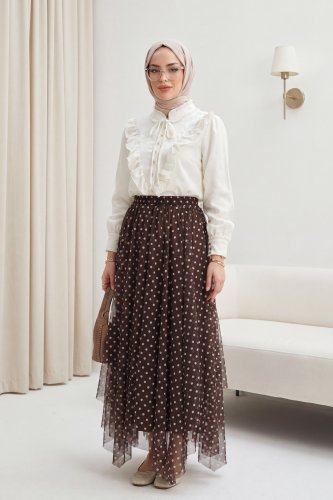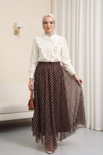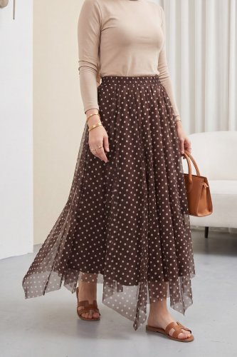 Beli Lastikli Asimetrik Kesim Parçalı Astarlı Şifon Etek -Kahve