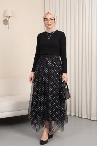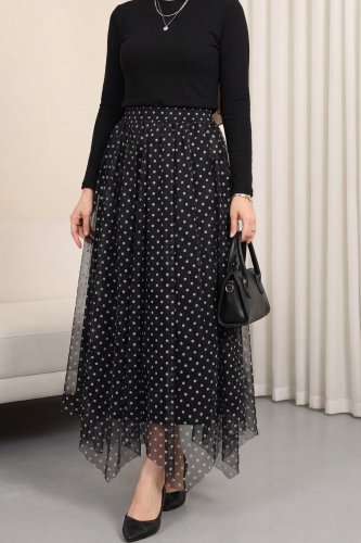 Beli Lastikli Asimetrik Kesim Parçalı Astarlı Şifon Etek -Siyah