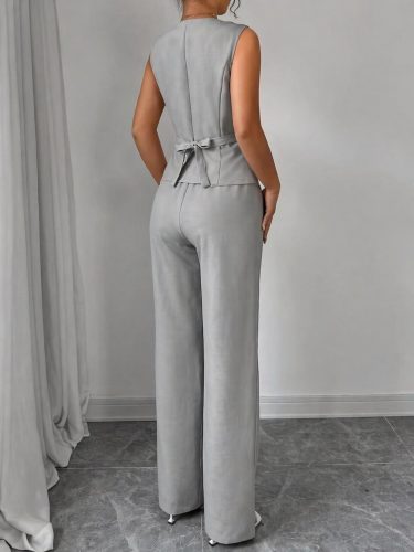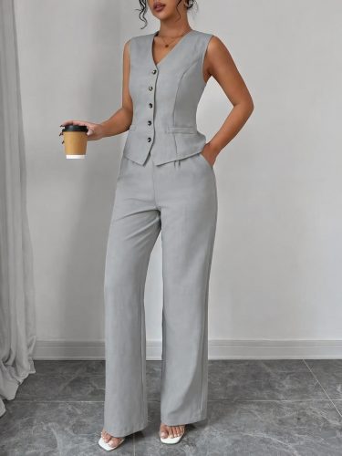 Kadın askılı önden düğmeli bluz ve pantolon keten ikili takım