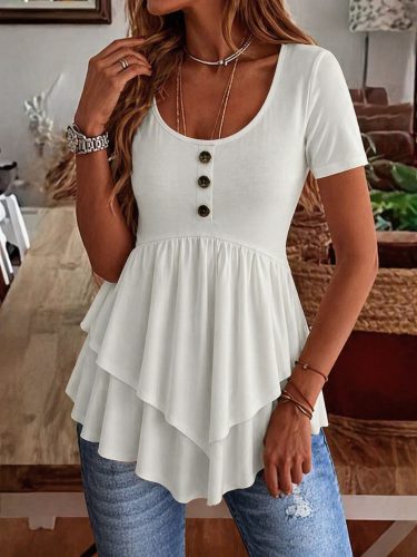 Kadın kısa kollu yuvarlak yakalı düğmeli önden asimetrik kesim detaylı viskon bluz