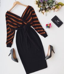 Çizgi desenli kruvaze yaka midiboy triko elbise 100 cm.