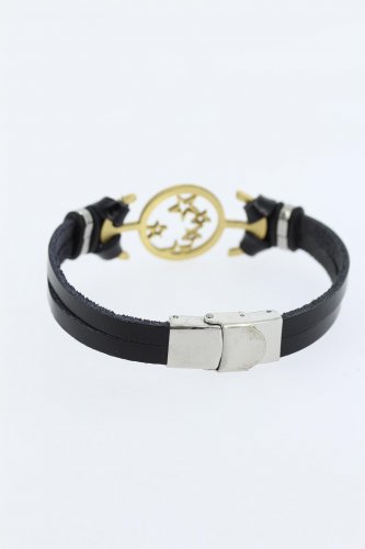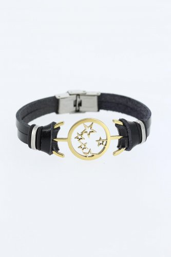 Gold Renk Yıldız Figürlü Metal Aksesuarlı Siyah Renk Deri Erkek Bileklik