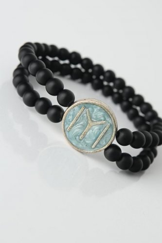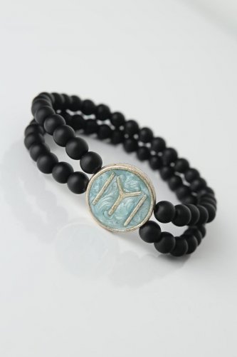 Mavi Renkli Metal Üzerine Kayı Boyu Figürlü Siyah Renk Çift Sıra Doğal Taş Erkek Bileklik
