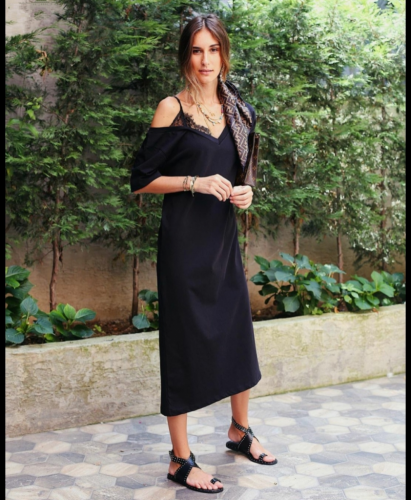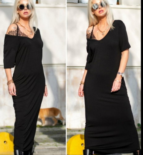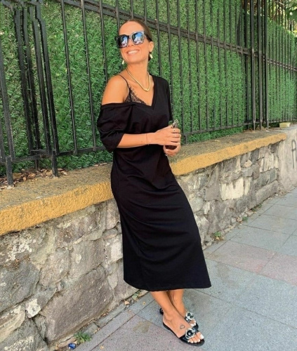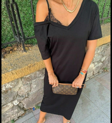 Kadın tek omuz askılı dantel detay V yaka viskon elbise