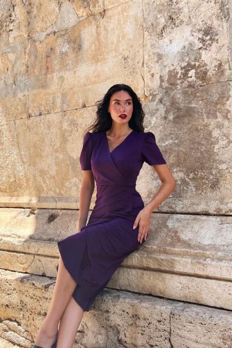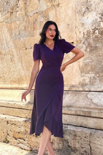 Volanlı Kuşaklı Kruvaze Yaka Midi Elbise Mor 581811