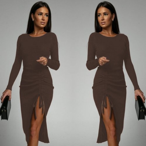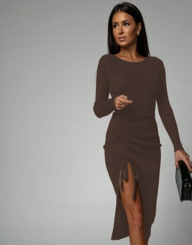 Kadın uzun kollu yandan büzgülü yırtmaç detay kaşkorse midi boy elbise