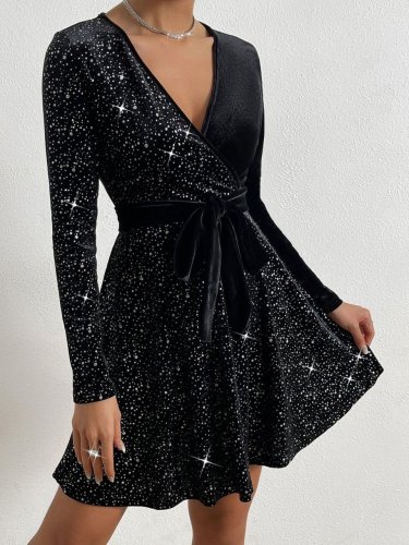 Kadın uzun kollu kruvaze yaka simli kadife kumaş elbise