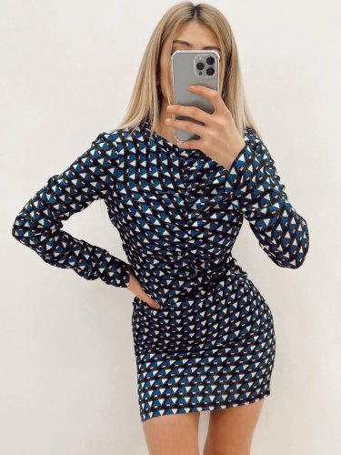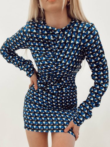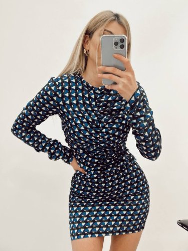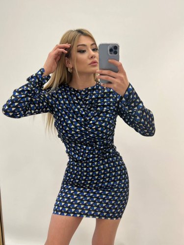 Kadın uzun kollu bisiklet yaka büzgü detay saten viskon kumaş mini elbise