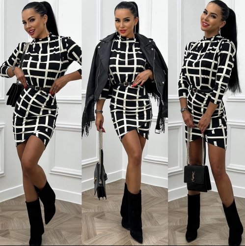 Kadın uzun kollu yarım balıkçı yaka eteği asimetrik kesim siyah beyaz kare desen mini dalgıç elbise