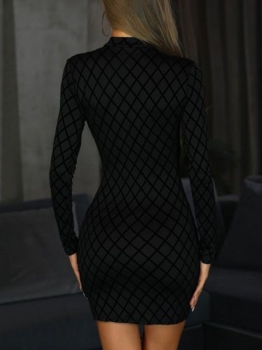 Kadın uzun kollu damla detay flok baskı dalgıç mini elbise