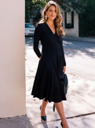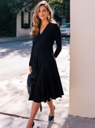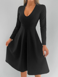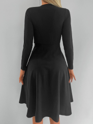 kadın siyah uzun kollu v yakalı cepli salaş krep elbise