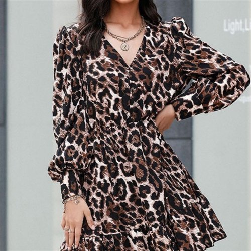 Kadın uzun kollu beli lastikli etek ucu volanlı leopar desen krep elbise